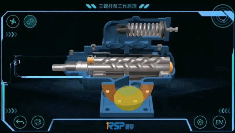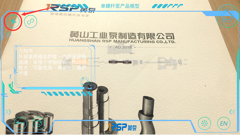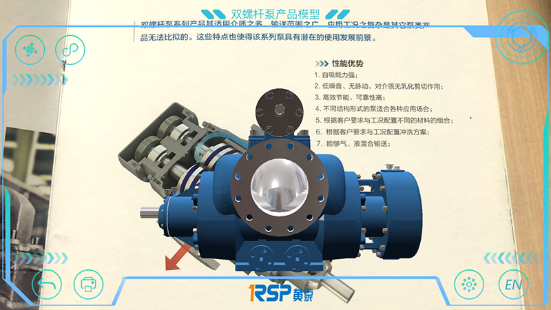 黄泵AR的第一个功能“AR产品”可通过手机、IPAD等移动设备的相机扫描对应图片,在相机视角展示黄泵三、双、单螺杆泵产品的三维建模,并包含产品零部件拆解介绍、播放工作原理动画等功能。