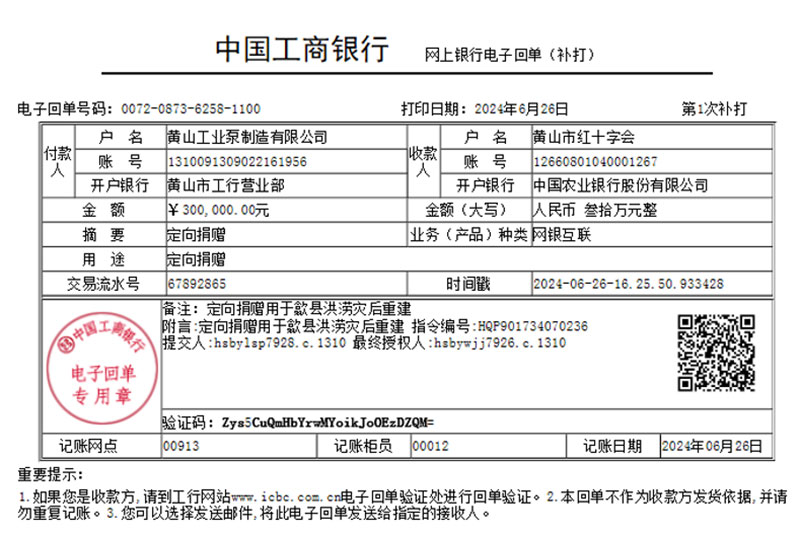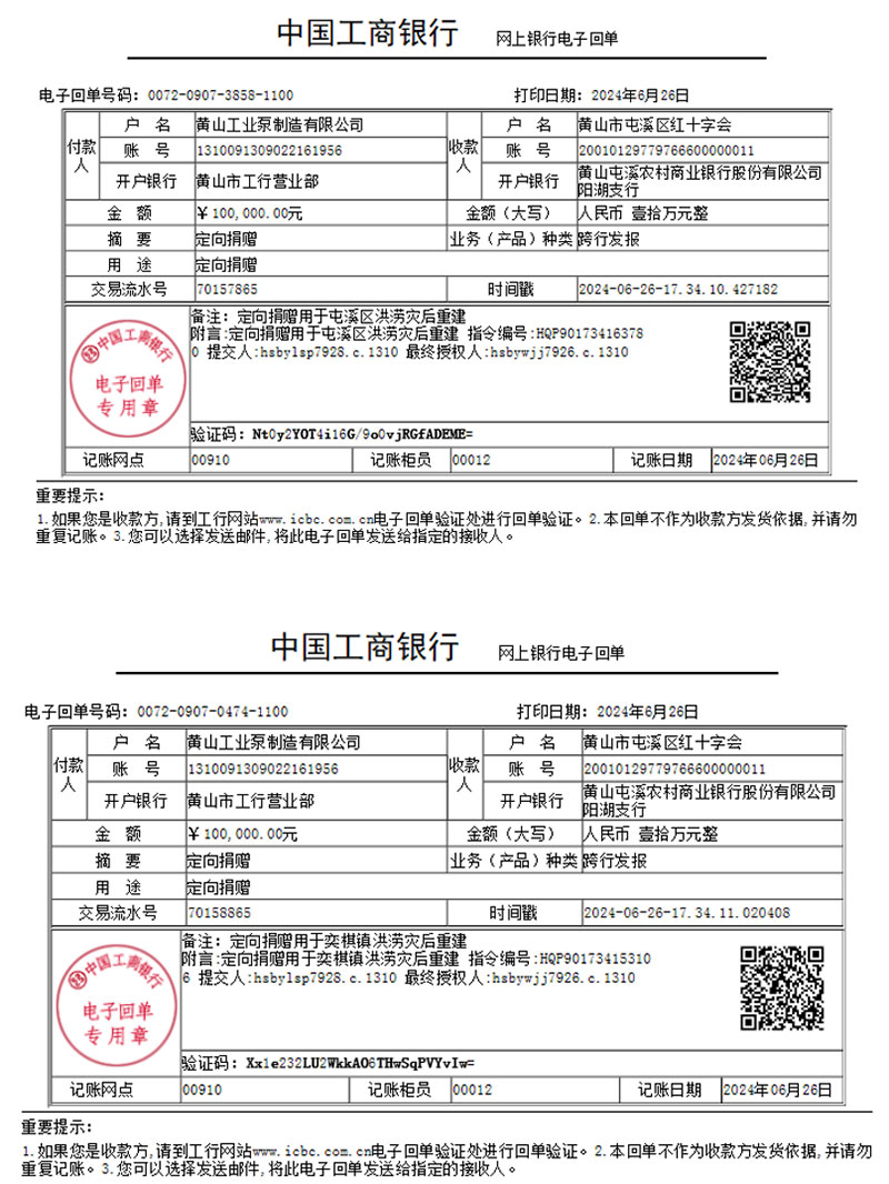 RSP黄泵向屯溪区红十字会、黄山市红十字会共计捐赠500000元,分别用于定向援助屯溪区及受灾最严重的歙县,开展抗洪救灾和灾后重建。